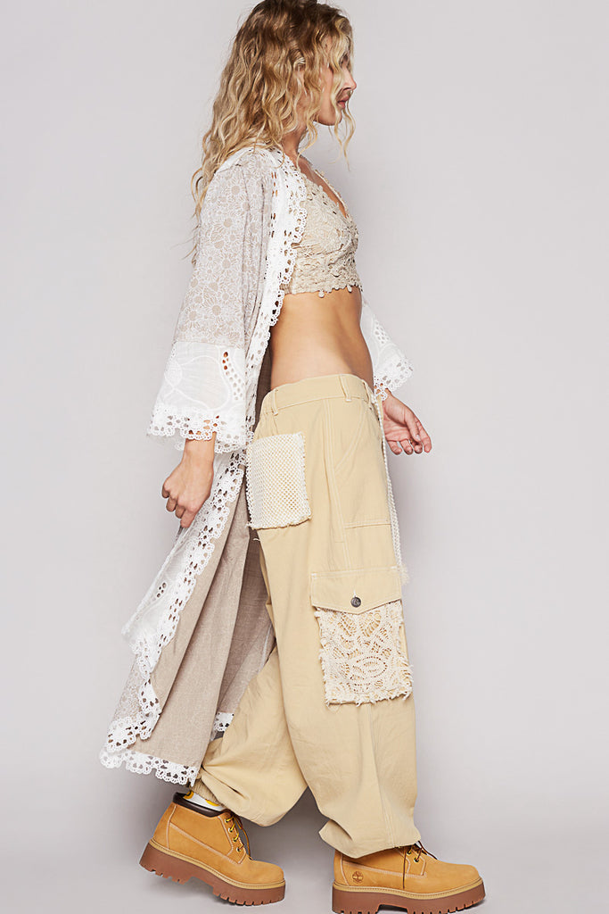 Designed in three quarter sleeve relaxed fit cardigan in print with outseam, lace patch, trim point, vintage washing.