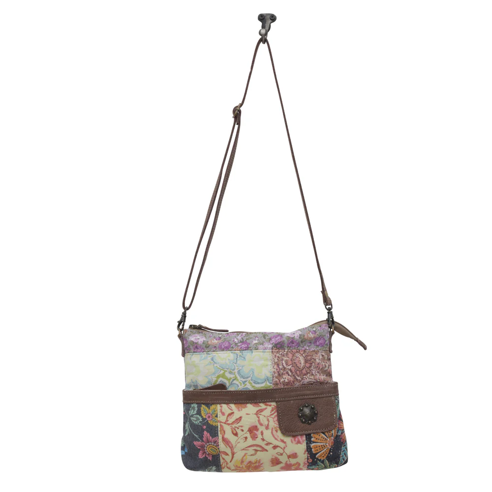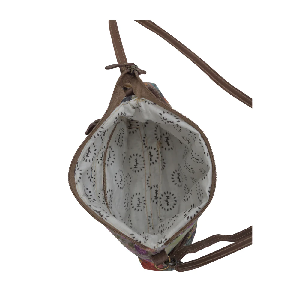 Add rustic elegance to your everyday style with this colorful and convenient western leather bag from Myra. Made from upcycled canvas and genuine leather, this bag features delicate flower-printed cotton that adds a fresh, feminine vibe. With its compact design and spacious compartments, this crossbody leather bag blends practicality with artisanal beauty that’s the preferred combination for today’s women.